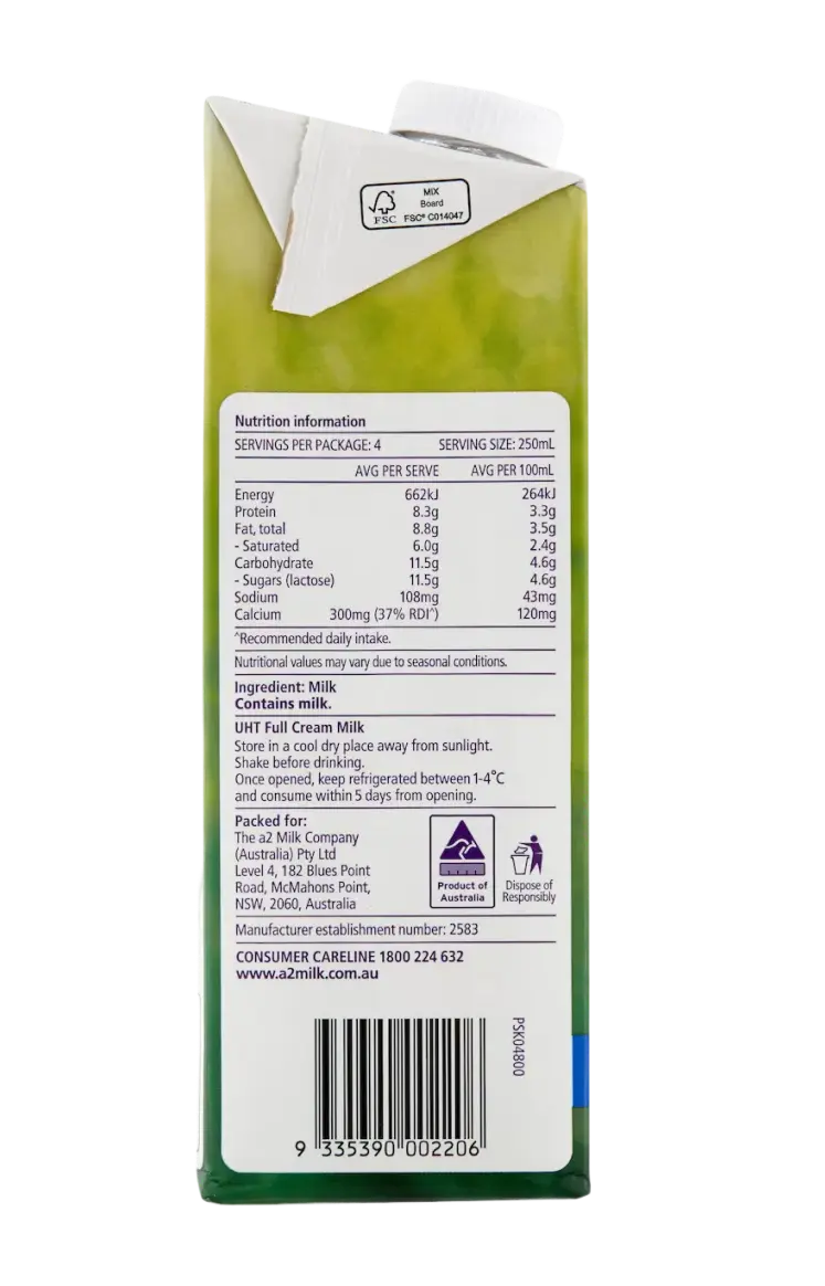 Made from pure Australian a2 Milk® which is high in calcium and can be enjoyed by the whole family*. Packaged for convenience, a2 Milk® Full Cream UHT is stable at room temperature.