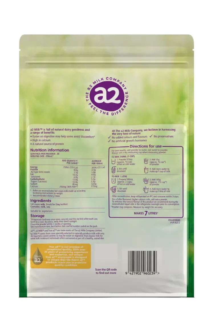 Our a2™ Full Cream Premium Instant Milk Powder is created through a drying process that removes the water but retains much of the goodness of a2 Milk® Full Cream. A glass of reconstituted milk has many of the same nutrients as regular milk.