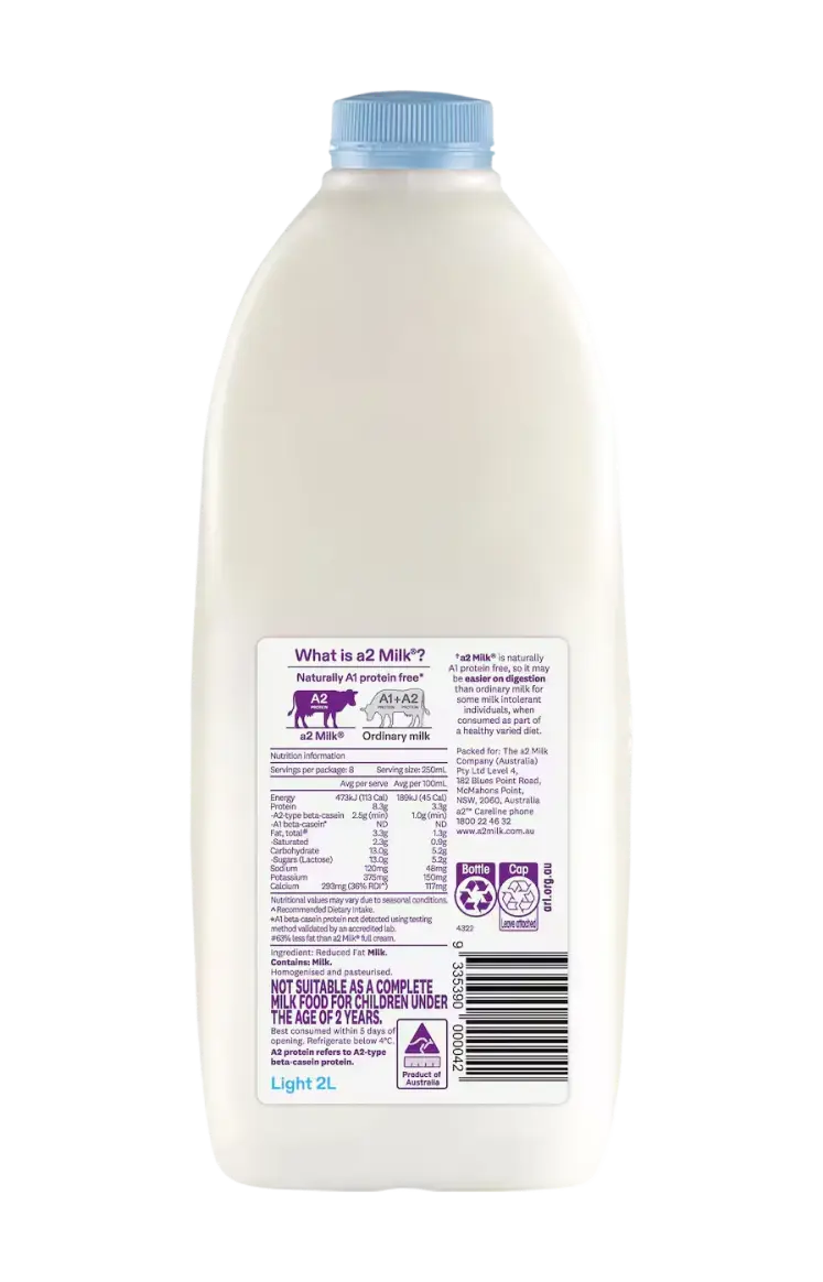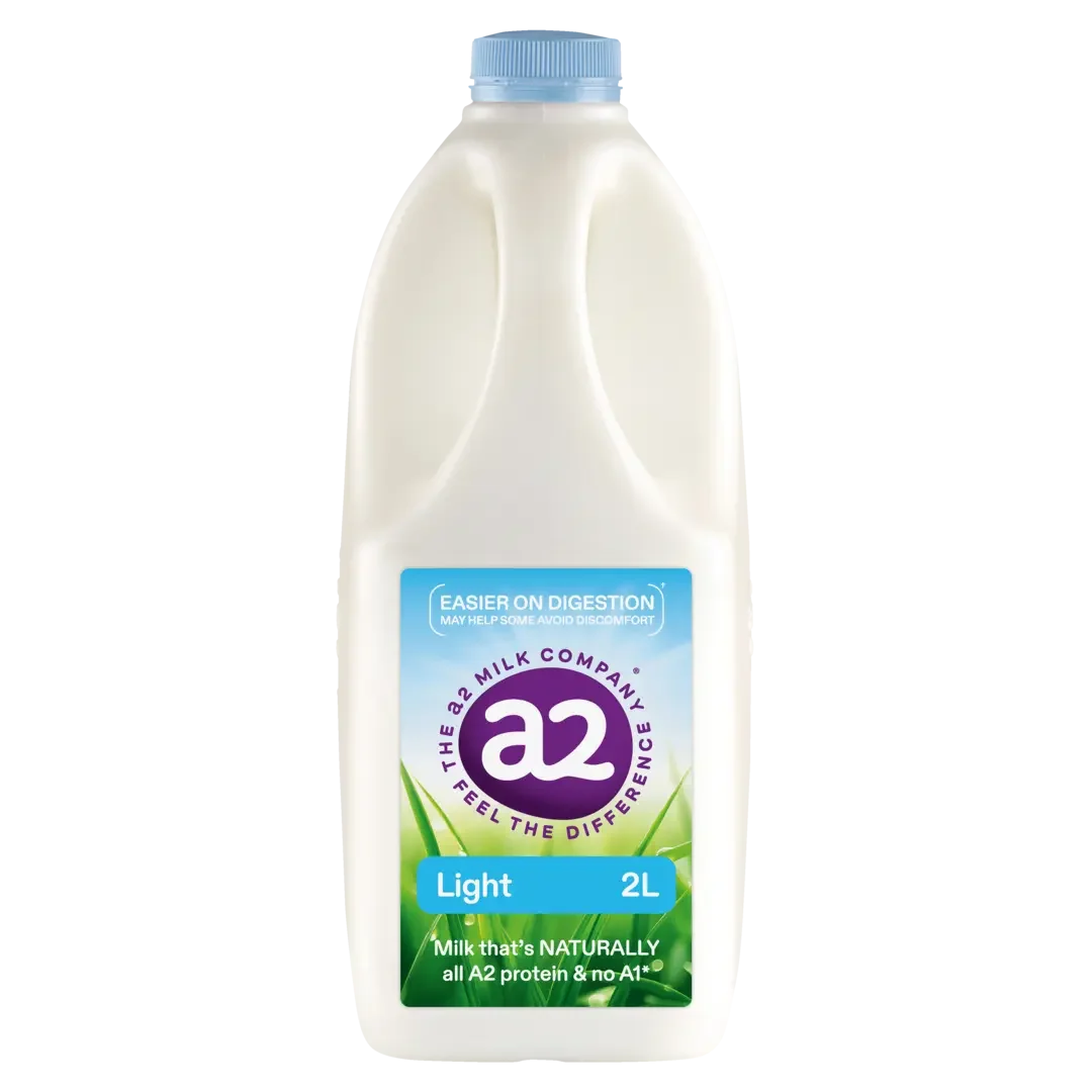 With only 1.3g of fat per 100ml, a2 Milk® Light is a low fat milk that tastes as good as full cream, and may be easier on digestion than ordinary milk for some milk intolerant individuals, when consumed as part of a healthy, varied diet*.