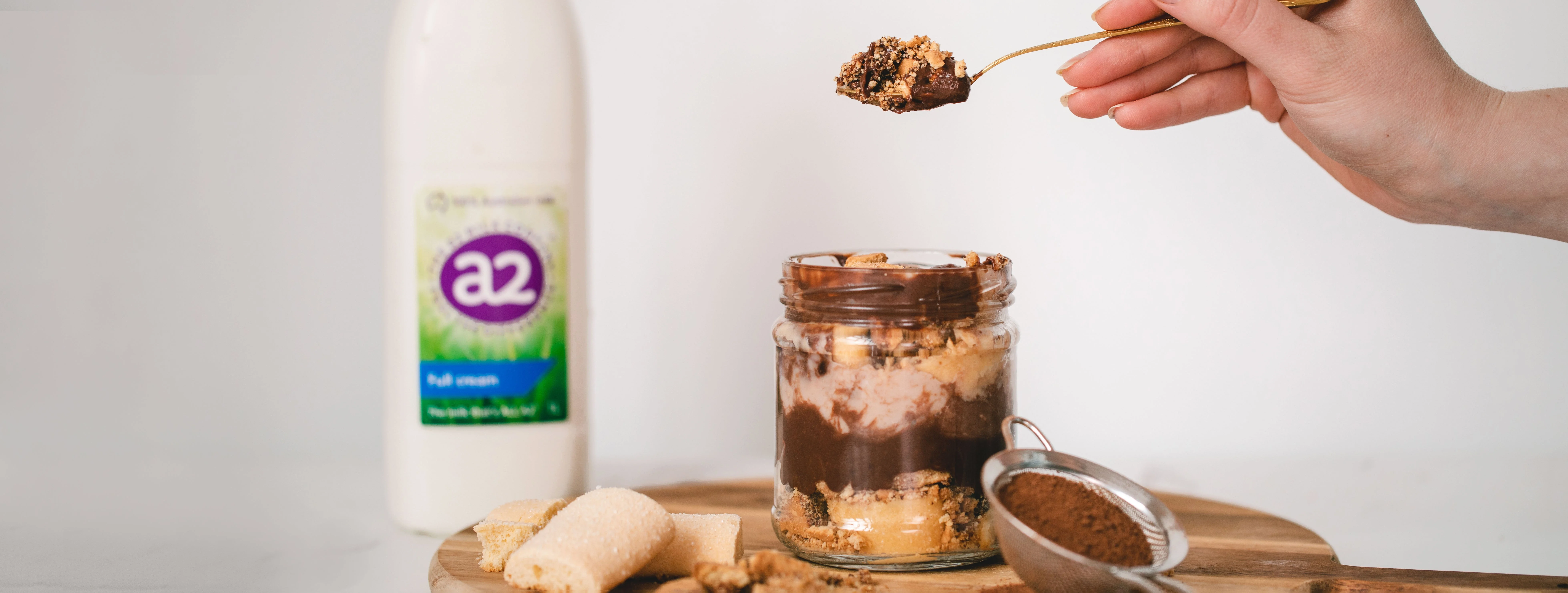 Prepare the base: Mix the 60ml a2 Milk® Full Cream with 1 tsp sugar. Break sponge fingers into thirds and soak each piece in the sweetened milk until softened.
