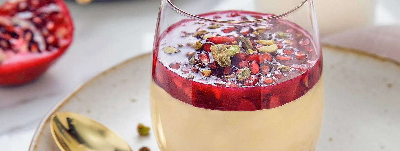 To serve, remove the plastic wrap. Top each custard with the remaining pomegranate seeds, drizzle with the pomegranate juice, and sprinkle with toasted pistachios.