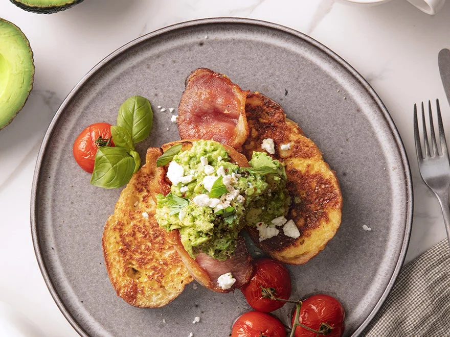 Top the French toast with roasted tomatoes, crispy bacon, sliced avocado, and crumbled feta. Garnish with fresh basil leaves and serve immediately.