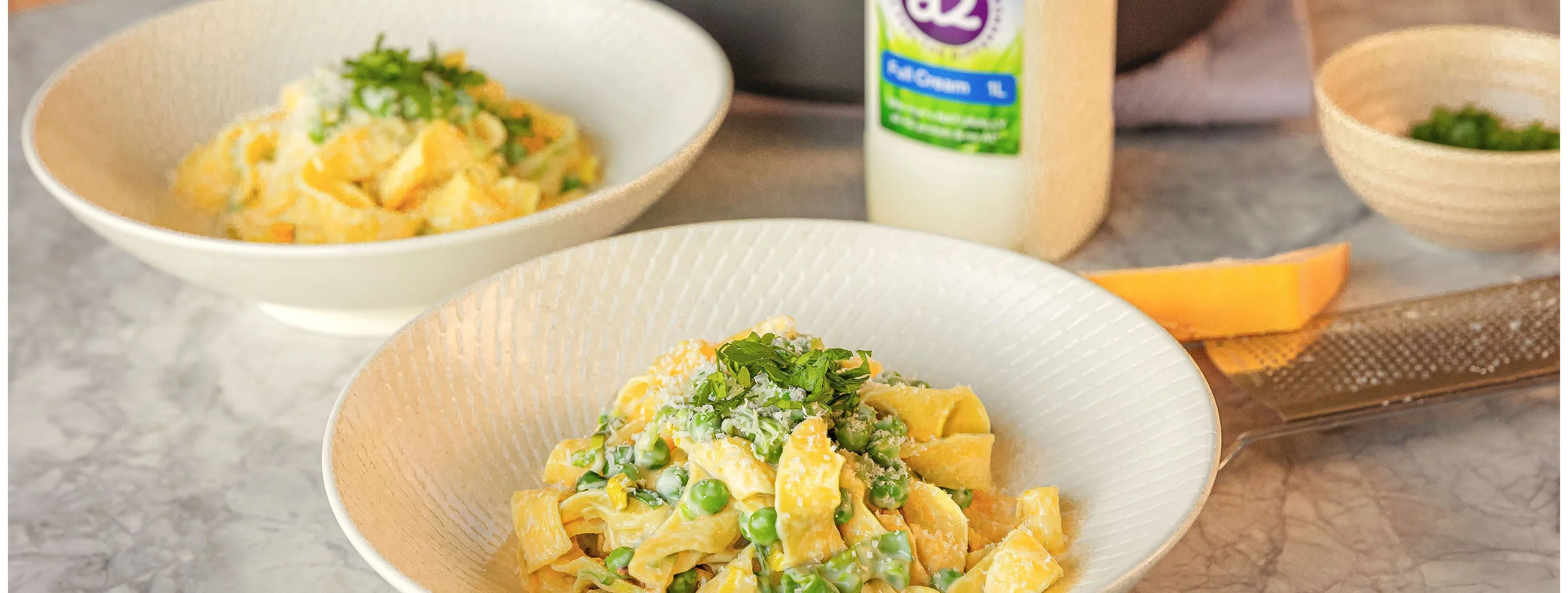 Begin to stir in a2 Milk® Full Cream a few splashes at a time. Ensure each batch fully incorporates into the flour mixture prior to adding more. Continue until all milk has been added. Heat the sauce to a gentle simmer.
